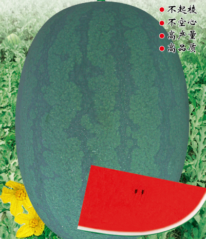 ■ 特征特性 :早熟種,雌花開放果實(shí)成熟28天左右。全生育期90天左右。植株長勢穩(wěn)健,抗病抗逆性強(qiáng),適應(yīng)性廣,易坐果。果實(shí)橢圓形,果皮墨綠色底上覆暗條帶,果面光滑無棱帶蠟粉。瓤色深紅,瓤質(zhì)酥脆,中心糖14%左右,口感好,風(fēng)味佳。平均單果重8-10kg左右,大者20kg以上(特殊栽培),一般畝產(chǎn)6000公斤以上。皮厚1.0cm左右,果皮硬度強(qiáng),耐儲(chǔ)運(yùn)。