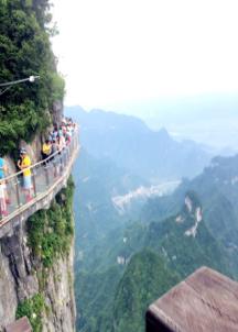 7日早上,我們來到了此行第一站——天門山。天門山海拔1500多米,因自然奇觀天門洞而蜚聲世界,被譽為“湘西第一神山”和“武陵之魂”。我們乘著觀光大巴沿著逶迤曲折的公路盤旋而上,只見壁立千仞,懸崖萬丈,每逢轉(zhuǎn)彎,車內(nèi)一片驚呼,盡顯刺激與緊張。下車后,我們繼續(xù)前行,當(dāng)大家爬過999層階梯最終到達(dá)巨大的天門洞前時,不禁感嘆大自然的鬼斧神工,神秘玄奇。往下眺望,林木蒼翠,山腳下的湖波像綠寶石一樣鑲嵌其中,美不勝收。清風(fēng)徐來,令人神清氣爽,視野開闊,豪氣頓生。天門山上的玻璃棧道,依峭壁凌空而建,讓人望而生畏,行而卻步。大家都小心翼翼,體驗雙腳處于萬丈深谷之上的驚險。