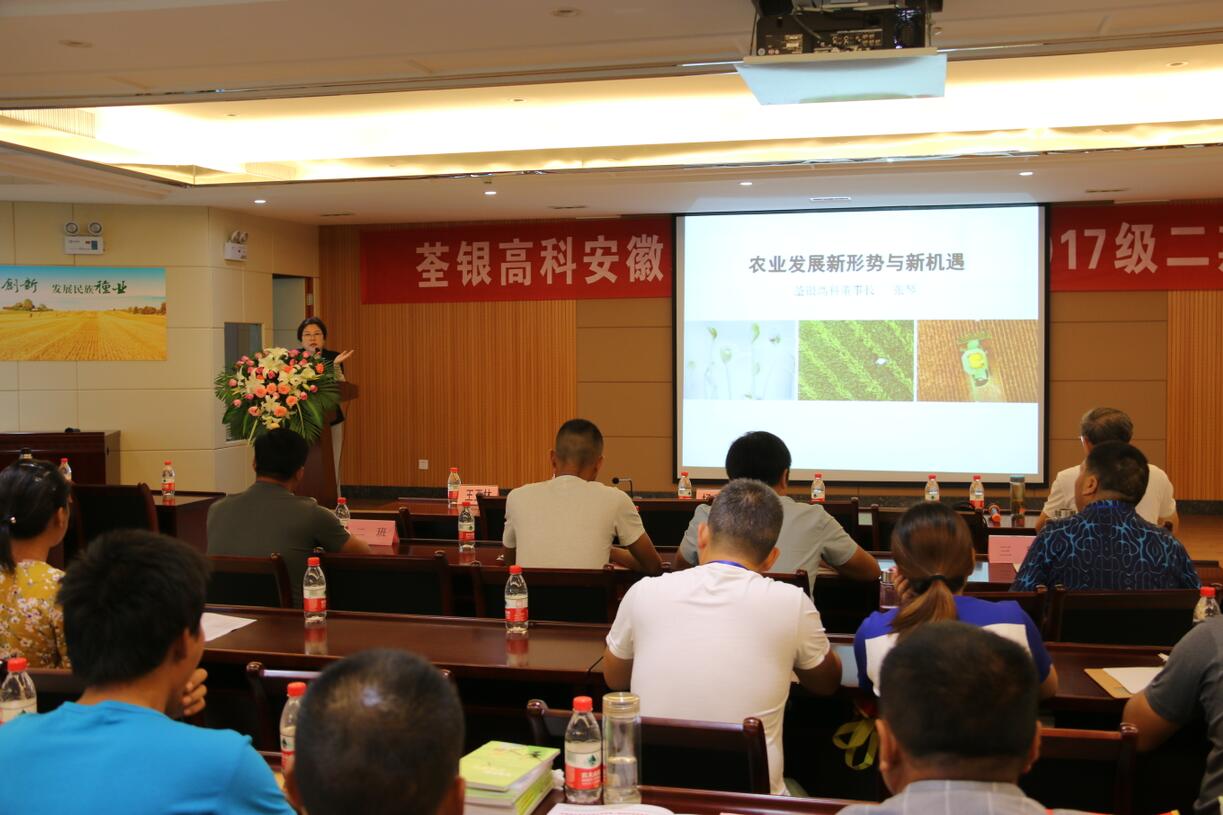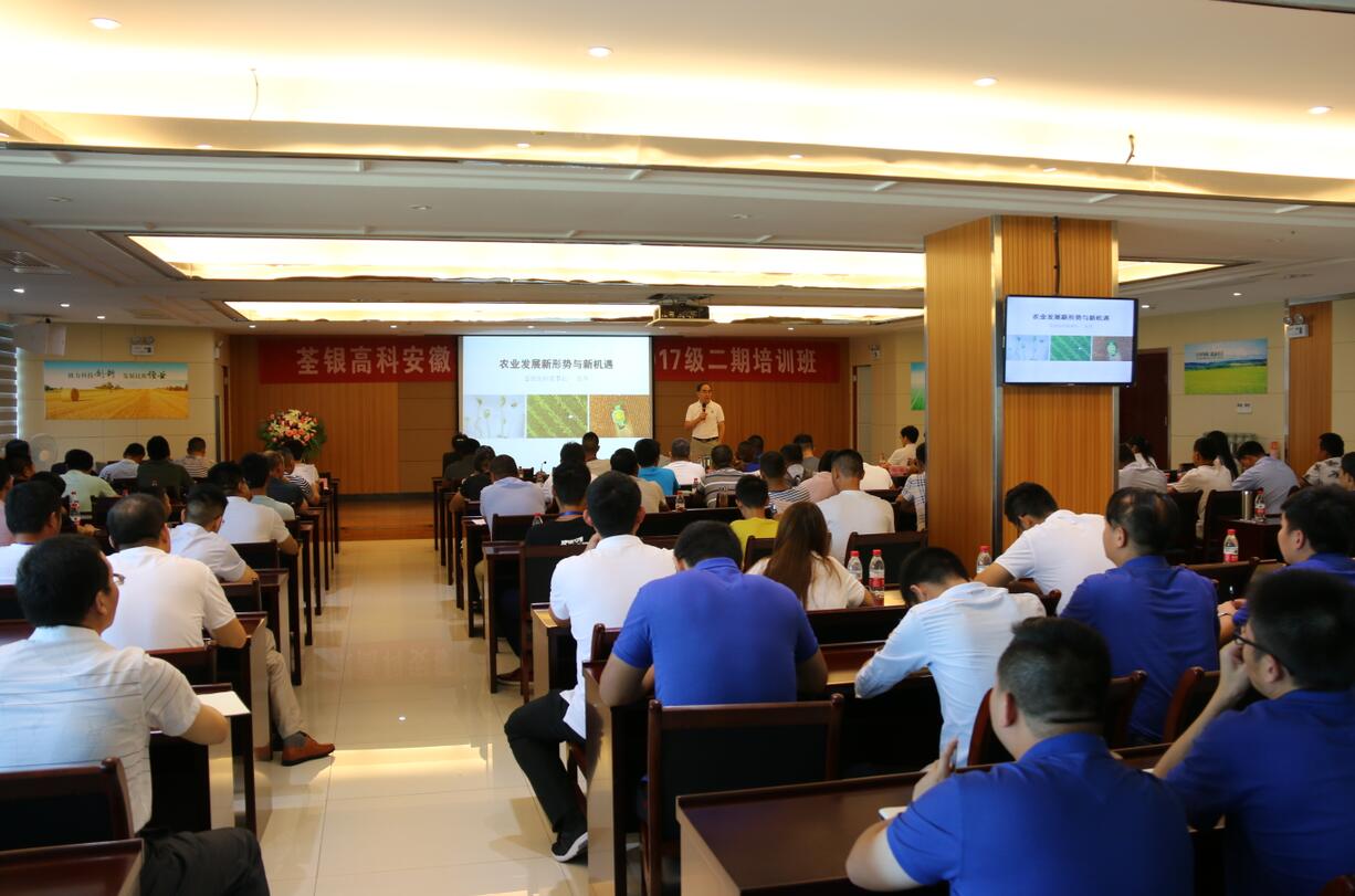 ??? 2018年7月19日,由安徽省農(nóng)委主辦、荃銀高科承辦的安徽現(xiàn)代青年農(nóng)場(chǎng)主培訓(xùn)2017級(jí)第二期培訓(xùn)活動(dòng)在公司六樓多功能廳展開(kāi)。安徽荃銀高科董事長(zhǎng)張琴、營(yíng)銷(xiāo)總監(jiān)王玉林,培訓(xùn)班總教務(wù)長(zhǎng)楊惠成老師,安徽張海銀基金會(huì)秘書(shū)長(zhǎng)張彤,及來(lái)自全省各地的100多位從事種植業(yè)的農(nóng)場(chǎng)主學(xué)員參加了培訓(xùn)。